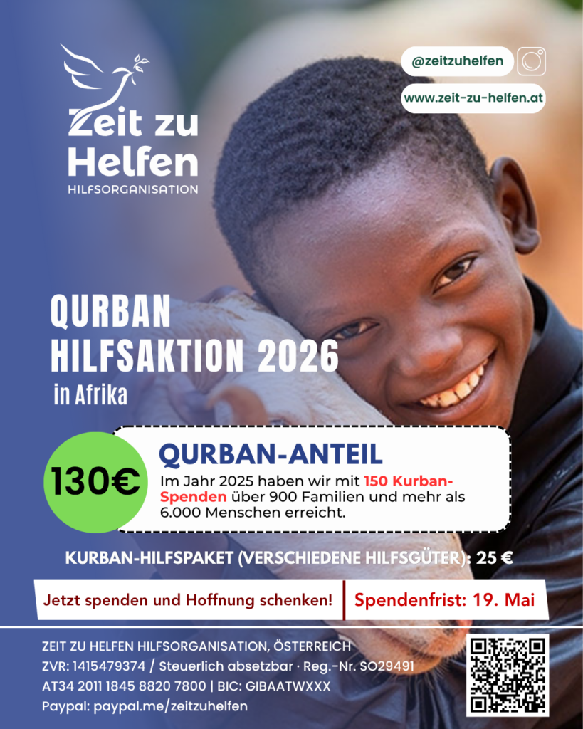 Jedes Jahr gehen Millionen Menschen Ihrer Pflicht zur Opfergabe nach dem Vorbild des Propheten Ibrahim (Abraham) nach. Zu diesem Anlass feiern die Muslim:innen das Kurbanfest (arabisch Eid al-Adha, türkisch Kurban Bayramı) um den Propheten in Erinnerung zu behalten. Dieser war Gott so ergeben, dass er sogar bereit war, seinen eigenen Sohn Ismail zu opfern.Zeit zu helfen arbeitet lediglich mit erfahrenen Mitarbeitern und Kooperationspartnern zusammen. So sorgen wir dafür, dass alle Tier-Spenden zum Opferfest, die Kurbanis, gesund, hygienisch und ethisch sowie nach islamischen Richtlinien behandelt werden.Um die Wirtschaft vor Ort zu unterstützen, werden die Tiere lokal bezogen. Deswegen wird Ihre Spende gesammelt und dort eingesetzt, wo es besonders nötig ist. Die Tiere werden dort im Voraus eingekauft, sodass die Schlachtung und Opfergabe bis zum 3. Opfertag sichergestellt werden kann.Wir unterstützen besonders benachteiligte Menschen und Familien, Kinder und Frauen sowie Waisen. Während des Kurbans liegt der Fokus besonders auf der Tradition des Teilens. Werden auch Sie ein Teil davon und unterstützen Sie mit einer Spende!